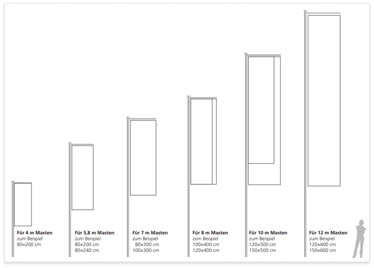 Der Ausleger sorgt dafür, dass die Fahne auch ohne Wind vollständig sichtbar bleibt. Er spannt die Fahne horizontal aus. Mit dem obenliegenden Hohlsaum wird die Fahne auf den Ausleger geschoben. Die Ränder sind verstärkt, an der Mastseite sind Karabiner montiert, einseitig bedruckt, das Druckbild ist durchscheinend und auf der Rückseite gespiegelt sichtbar. Flaggenmesh ist für insbesondere für Gebiete mit hoher Windlast geeignet, Flaggenstoff für überall.